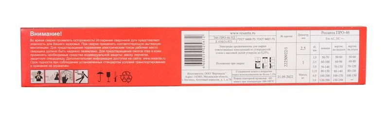 Сварочные электроды РЕСАНТА ПРО-46:• Малочувствительны к качеству подготовки кромок свариваемых деталей.• Позволяют проводить сварку оцинкованной, окрашенной, загрязненной и слегка ржавой стали, а также на обильно увлажненной поверхности.• Обладают повышенной, на 20% большей, прочностью сварного шва по сравнению с электродами марки МР-3• Позволяют выполнять сварку на предельно низких токах во всех пространственных положениях, в том числе «сверху вниз».• ПРО-46 просты в применении даже для начинающих сварщиков, в сравнении с моделями основных конкурентов, т.к. отличаются более легким начальным и повторным поджигом, мягким и стабильным горением дуги.• Малые потери металла от разбрызгивания• Отличное формирование металла шва• Легкая отделимость шлаковой корки• Возможность проводить сварку на переменном и постоянном токах, Тип товаров: Электроды РЕСАНТА, Вес в упаковке: 1 кг, Гарантия, мес.: 12, Свариваемый материал: Сталь, Покрытие: Рутиловое, Длина, мм: 350, Диаметр, мм: 2, Назначение: Универсальные, Страна бренда: Латвия, Страна производства: Россия, Модель: ПРО-46 Ф2,5 Пачка 1 кг, Штрихкод EAN-13: 4606060000000"