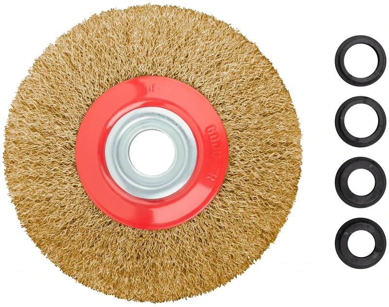 Тип «колесо». Для станков заточных. С пластиковыми адаптерами на разные посадочные диаметры. По 2 штуки каждого типа адаптеров. Материал: стальная латунированная волнистая проволока. Упаковка: картонная коробка.
