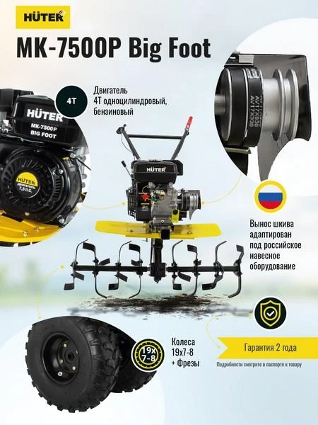 Отличительная особенность модели HUTER МК-7500Р BIG FOOT - большие колеса 19х7-8, которые не дадут машине увязнуть в грунте.