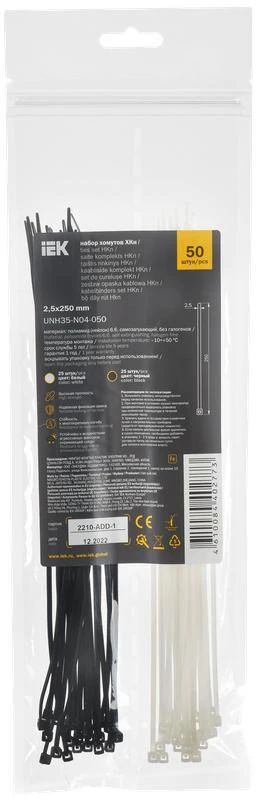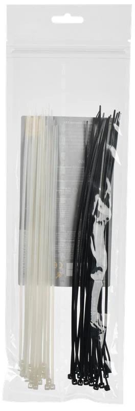 Набор включает в себя 25 чёрных (2,5х250) и 25 белых (2,5х250) кабельных хомутов.