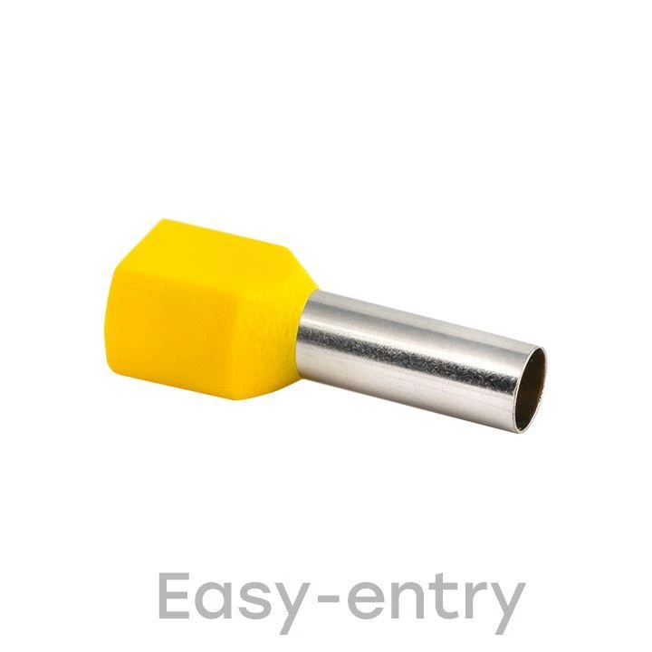 Опрессовку наконечников проводят припомощи пресс-клещей. Заведите предварительно зачищенные концы провода в наконечник. Втулочный наконечник опрессуйте поверх металлической втулки, штыревой поверх изолированной ПВХ-манжеты. Выступающую из наконечника часть зачищенной жилы можно обрезать после завершения опрессовки. Перед тем как подсоединять опрессованный наконечник к клемме, проверьте, что его изоляция не нарушена, а жила надежно зафиксирована (провод не двигается внутри наконечника).