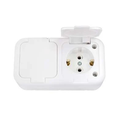 Представляет собой двухместную розетку с крышкой, с заземлением. Цвет: белый.