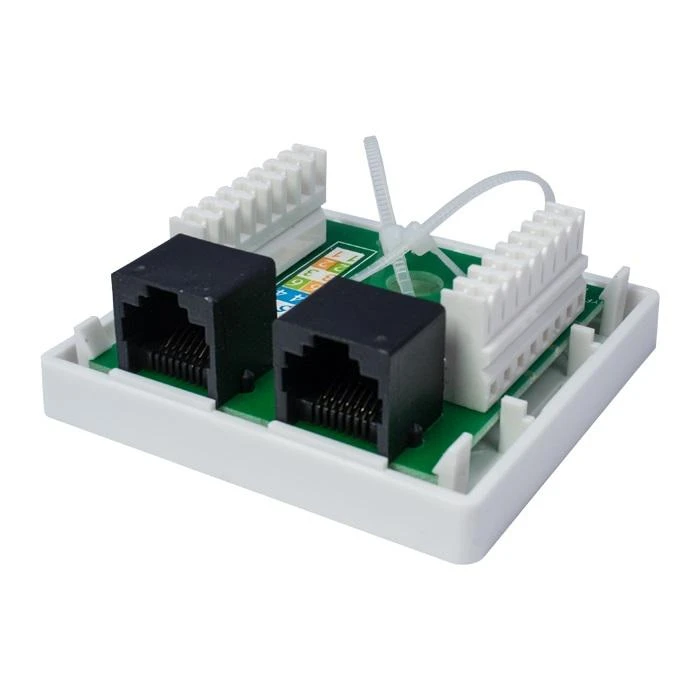 На печатной плате установлены контакты типа Dual IDC с цветной маркировкой по двум стандартам: T568 А и B. Ножи контактов располагаются под 45°, что лучше сказывается на передаточных характеристиках разъема. Для заделки проводников подходят ножи тип 110 и Krone.