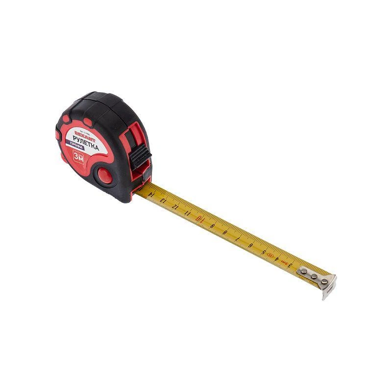 Инструмент оснащен удобным зацепом с отверстием посередине, которое позволяет зафиксировать полотно рулетки на шляпке гвоздя или самореза.