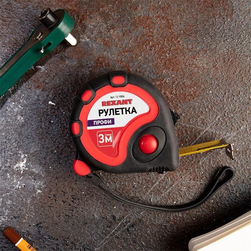 На корпусе расположена клипса-зажим для фиксации рулетки на ремне, кармане или поясной сумке. Ремешок позволяет надевать инструмент на запястье, чтобы освободить руки для работы.
