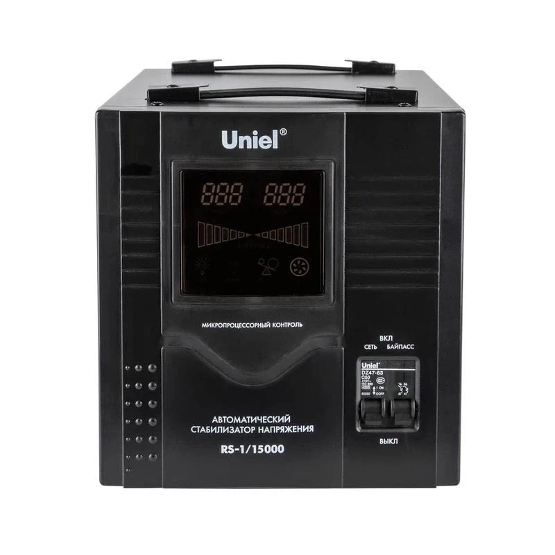 Стабилизатор напряжения Uniel RS-1/15000WS, с гальванической развязкой рассчитан на номинальную мощность нагрузки 15000 ВА и максимальный ток 25 А.