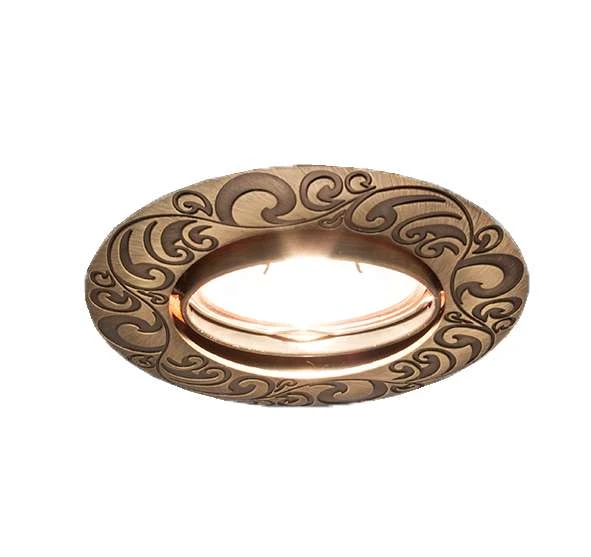 Корпус литой, из алюминия, цвета состаренной бронзы, матовый, с орнаментом темно-бронзового цвета по поверхности. Диаметр 90 мм, диаметр отверстия 75 мм.