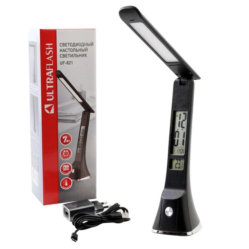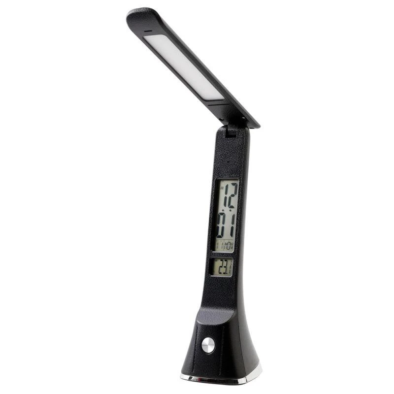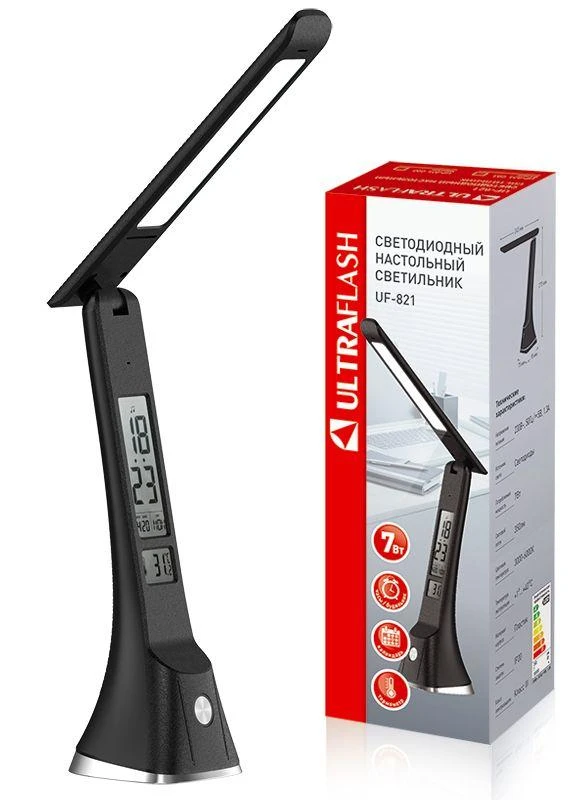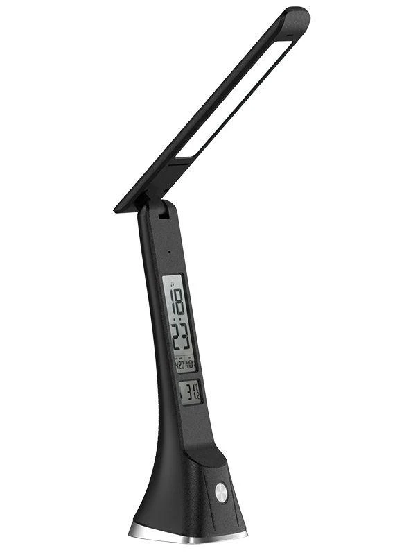 Цвет черный, источник света - встроенные светодиоды, мощность 7Вт, световой поток 350Лм, димируемый, цветовая температура 3000К-6000К, смена цветовой температуры, с дисплеем, календарем, таймером, термометром.