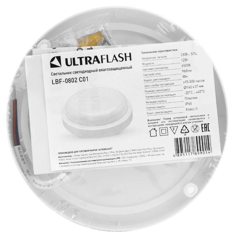 Ultraflash LBF-0802 C01, круг, мощность 12Вт, световой поток 960лм, цветовая температура 6500К, источник света - встроенные светодиоды, степень защиты IP65, размер 140*37мм, материал-пластик.
